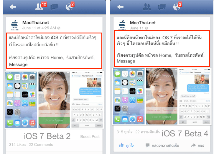 แต่หลังจากเปิด iOS 7 Beta 1 ไปได้ไม่นาน แอปเปิลก็ได้อัพเดตการแสดงผลภาษาไทยอย่างการแก้ปัญหาเรื่องสระลอยใน iOS 7 Beta 2 และล่าสุดกับ iOS 7 Beta 4 แอปเปิลได้มีการปรับรูปแบบการแสดงผลภาษาไทยไปอีกพอสมควร ทาง MacThai ของรวบรวมไว้ดังนี้