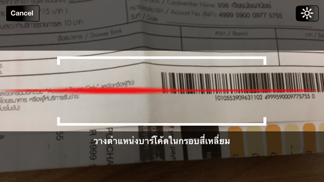 เลือก “Scan and Pay” โปรแกรมจะเปิดกล้องของเราขึ้นมา และมีช่องกำกับว่าให้สแกนบาร์โค้ดจากบิลค่าบริการ