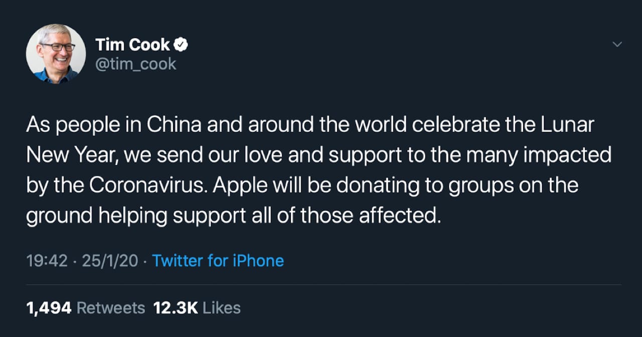 เมื่อคืนที่ผ่านมา Tim Cook ซีอีโอของแอปเปิลที่ทุกคนรู้จักกันดีได้ออกมาทวีตข้อความส่วนตัวเกี่ยวกับ แอปเปิลได้ร่วมบริจาค สมทบทุนให้กับจีน เพื่อช่วยเหลือวิกฤตไวรัสโคโรน่าสายพันธุ์ใหม่ 2019 ที่กำลังเป็นข่าวอยู่ตอนนี้โดยทิม คุกได้ออกมาทวีตข้อความว่า หลังจากที่ผู้คนได้เฉลิมฉลองเทศกาลตรุษจีนไป แอปเปิลได้ส่งกำลังใจและช่วยสนับสนุนผลกระทบจากไวรัสโคโรน่า โดยแอปเปิลเตรียมบริจาคเงินให้กับผู้ได้รับผลกระทบจากวิกฤตนี้สำหรับวิกฤตไวรัสโคโรน่า ต้องถือว่าคนไทยทุกคนต้องคอยระวังเป็นอย่างมากเพราะว่าตอนนี้ยังไม่มีวัคซีนหรือยารักษาได้ ถ้าจำเป็นต้องไปในที่คนแออัด แนะนำให้ใส่หน้ากากอนามัย และล้างมือให้สะอาดตลอดเวลา
