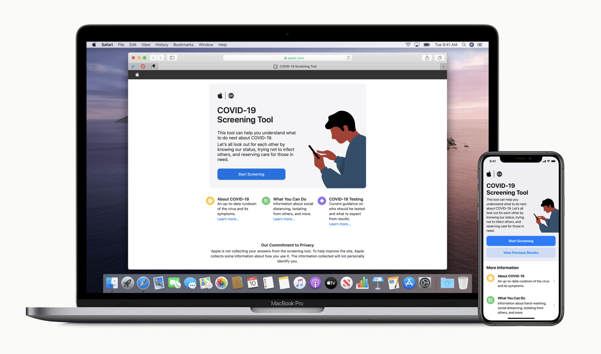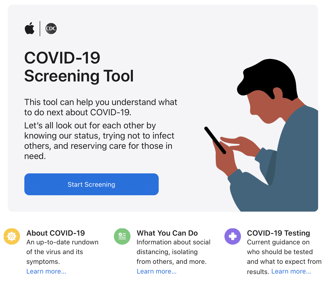 ล่าสุดในการรับมือกับการระบาดของ Coronavirus สายพันธุ์ใหม่นั้น ทาง Apple ได้ร่วมมือกับ CDC หรือกรมควบคุมโรคของสหรัฐฯ เปิดตัวแอพและเว็บไซต์ ที่ชื่อว่า Apple COVID-19 เพื่อใช้ในการให้ข้อมูล และคัดกรองอาการความเสี่ยงในการป่วยด้วยโรค COVID-19