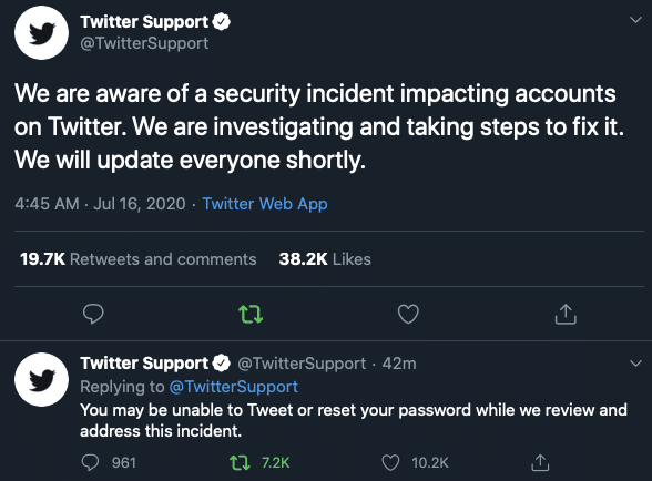 นี่นับว่าเป็นการ Hack ครั้งประวัติศาสตร์ เพราะถ้าดูรายชื่อคนที่กล่าวมาก็ล้วนแต่เป็นบุคคลสำคัญระดับโลก ในขณะที่ทั่วโลกกำลังสับสน ทาง Twitter ก็ได้ออกมาแถลงอย่างรวดเร็วว่า We are aware of a security incident impacting accounts on Twitter. We are investigating and taking steps to fix it. We will update everyone shortly. หรือทาง Twitter ได้ตรวจพบพฤติกรรมการโจมตีด้านความปลอดภัย และจะอัพเดทให้ทุกคนฟังว่าเกิดอะไรขึ้น ในขณะที่มีการทวีตตามมาจากทาง Twitter เองบอกว่า You may be unable to Tweet or reset your password while we review and address this incident. หรือเราอาจจะไม่สามารถทวีตหรือแก้ไขรหัสผ่านได้ ณ ตอนนี้ (ป้องกันการ Hijack บัญชี)