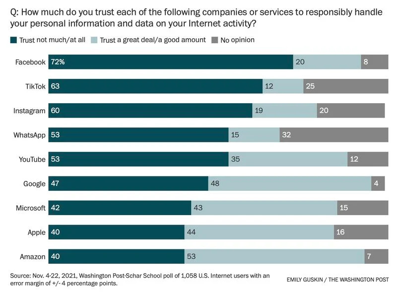 จากแบบสำรวจใหม่ที่เผยออกมา มีผู้ใช้เป็นจำนวนมากที่ไว้ใจ Amazon และ Google ให้จัดการข้อมูลของตัวเองและกิจกรรมการใช้อินเทอร์เน็ตมากกว่า Apple ในขณะที่ผู้ใช้ส่วนใหญ่ไม่ไว้ใจ FaceBook, TikTok, และ Instagram เป็นอย่างมาก