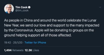 เมื่อคืนที่ผ่านมา Tim Cook ซีอีโอของแอปเปิลที่ทุกคนรู้จักกันดีได้ออกมาทวีตข้อความส่วนตัวเกี่ยวกับ แอปเปิลได้ร่วมบริจาค สมทบทุนให้กับจีน เพื่อช่วยเหลือวิกฤตไวรัสโคโรน่าสายพันธุ