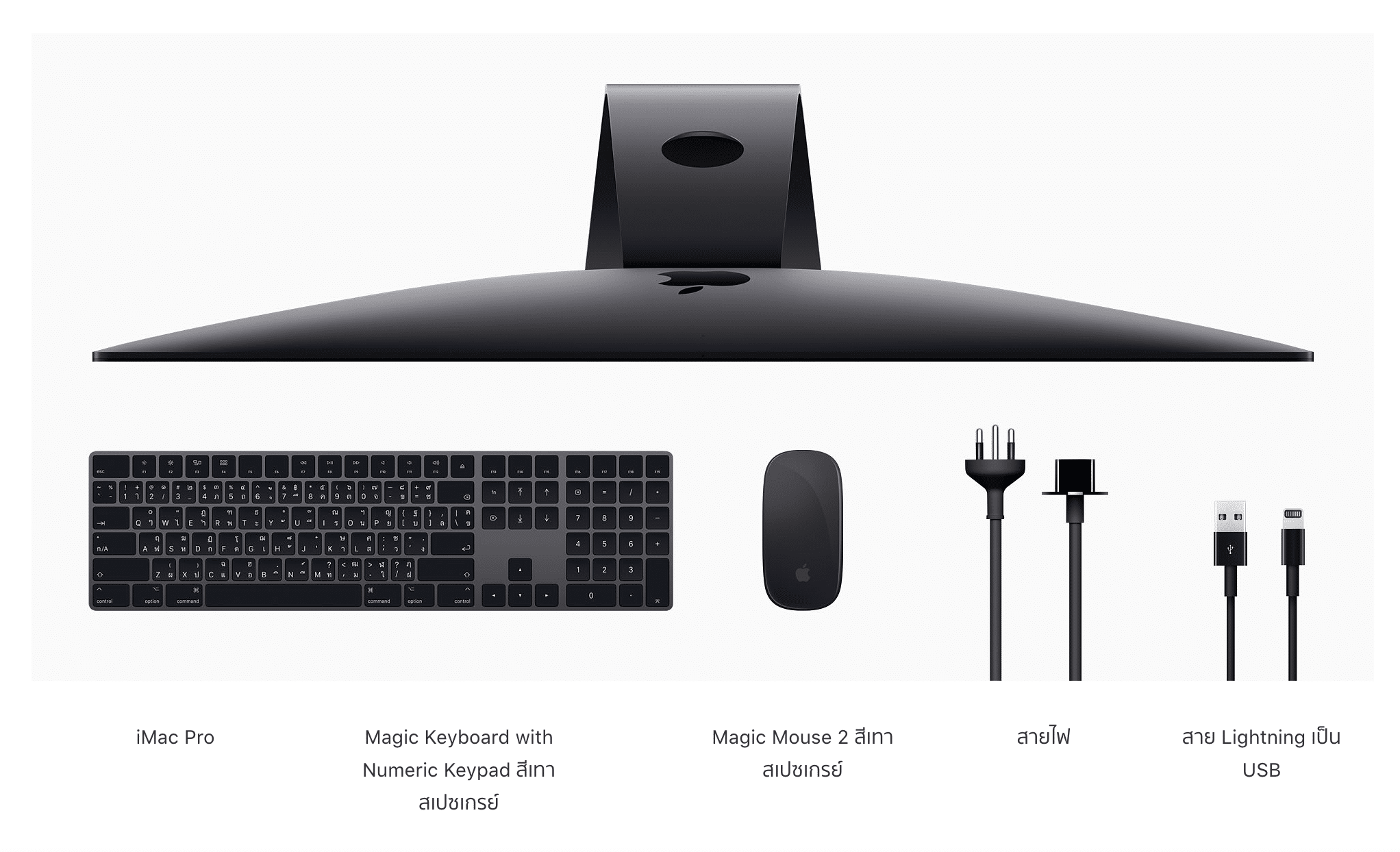 - อุปกรณ์เสริม นอกจากตัวจอที่มีประสิทธิภาพน่าเหลือเชื่อแล้ว Apple ก็มีอุปกรณ์เสริมที่ใส่มาในกล่อง พร้อมเป็นสีเทาสเปซเกรย์ที่เข้าคู่กับ iMac Pro ได้อย่างดี